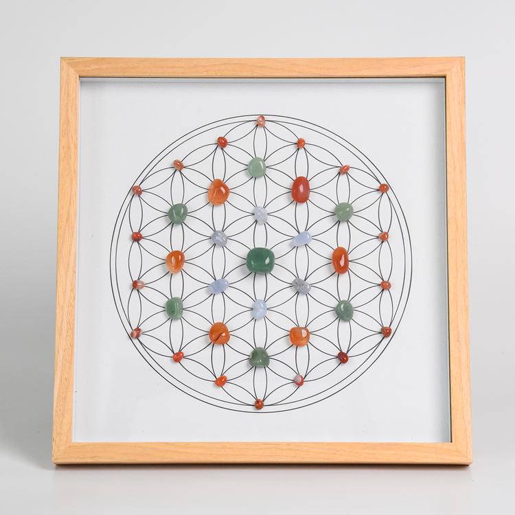 Materials: Natural Aventurine, Carnelian, Blue Lace Agate, Red Jasper (or similar); wooden frame