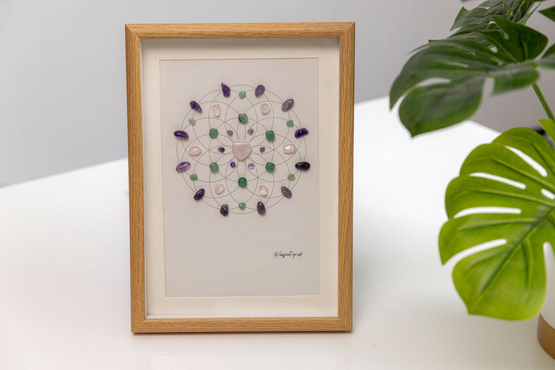 Elegantly framed and thoughtfully arranged, this piece features a Flower of Life–inspired geometry—a timeless symbol of creation, unity, and divine feminine energy.